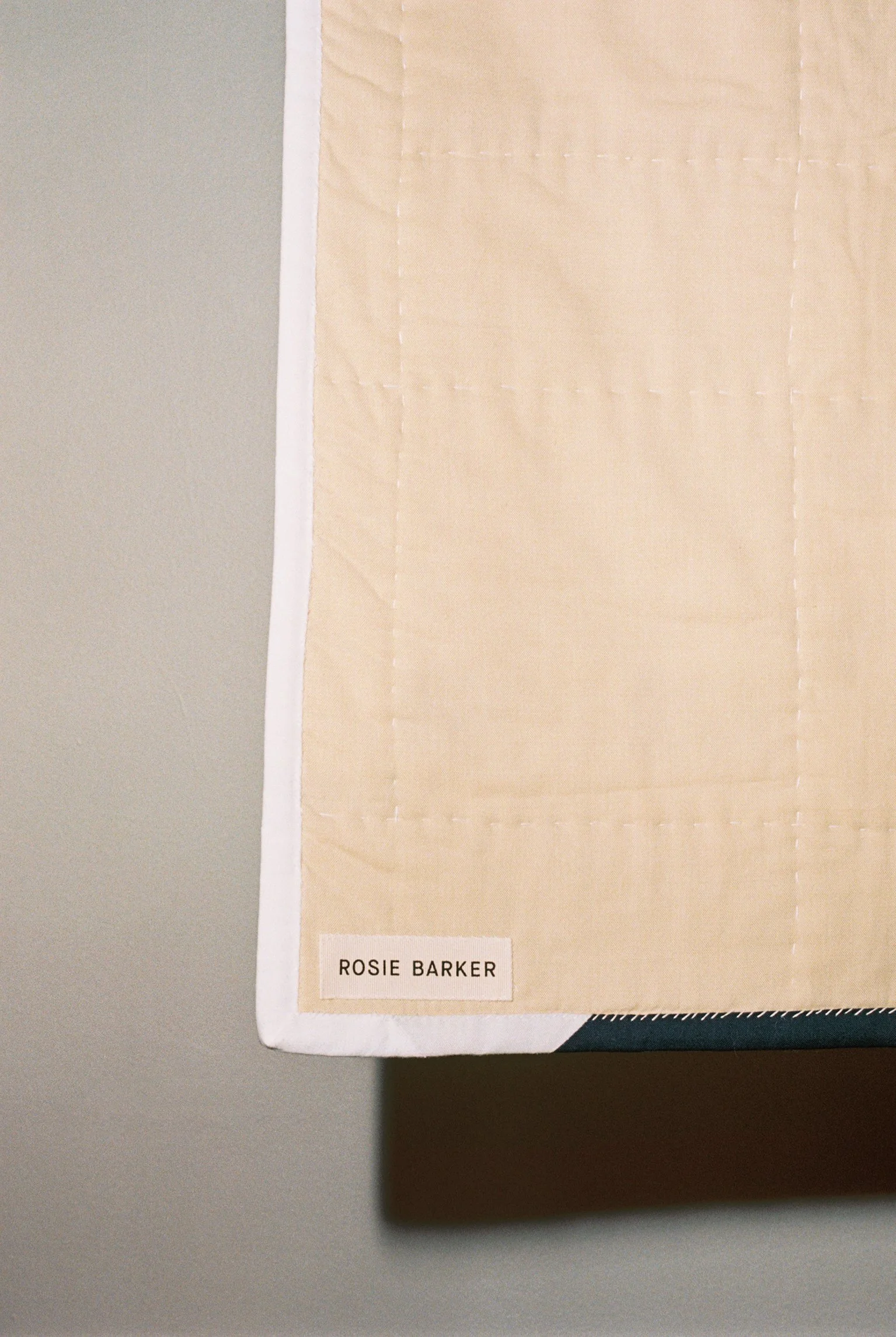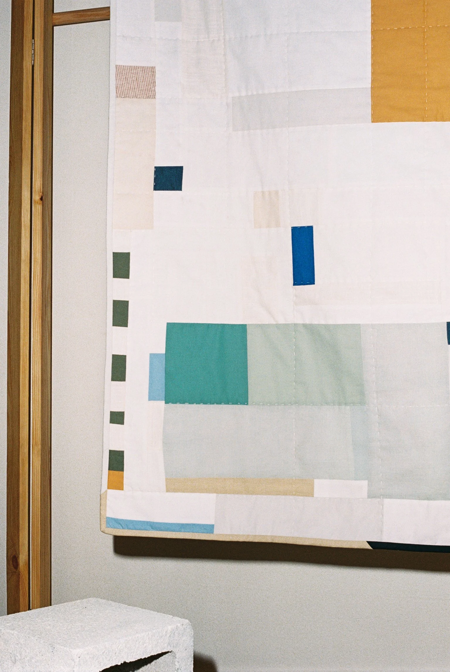 INSPIRATION: The scenery where this quilt was made no doubt played a role in the design. Exquisite mountains of the Eastern Sierra; cerulean skies; daily deer visits; and free-roaming rabbits and lizards. The name, Louisa, comes from my favorite childhood film, The Sound of Music. The color scheme felt reminiscent; the scene where Maria cut up the curtains to make the children play clothes had an everlasting influence on my designs.