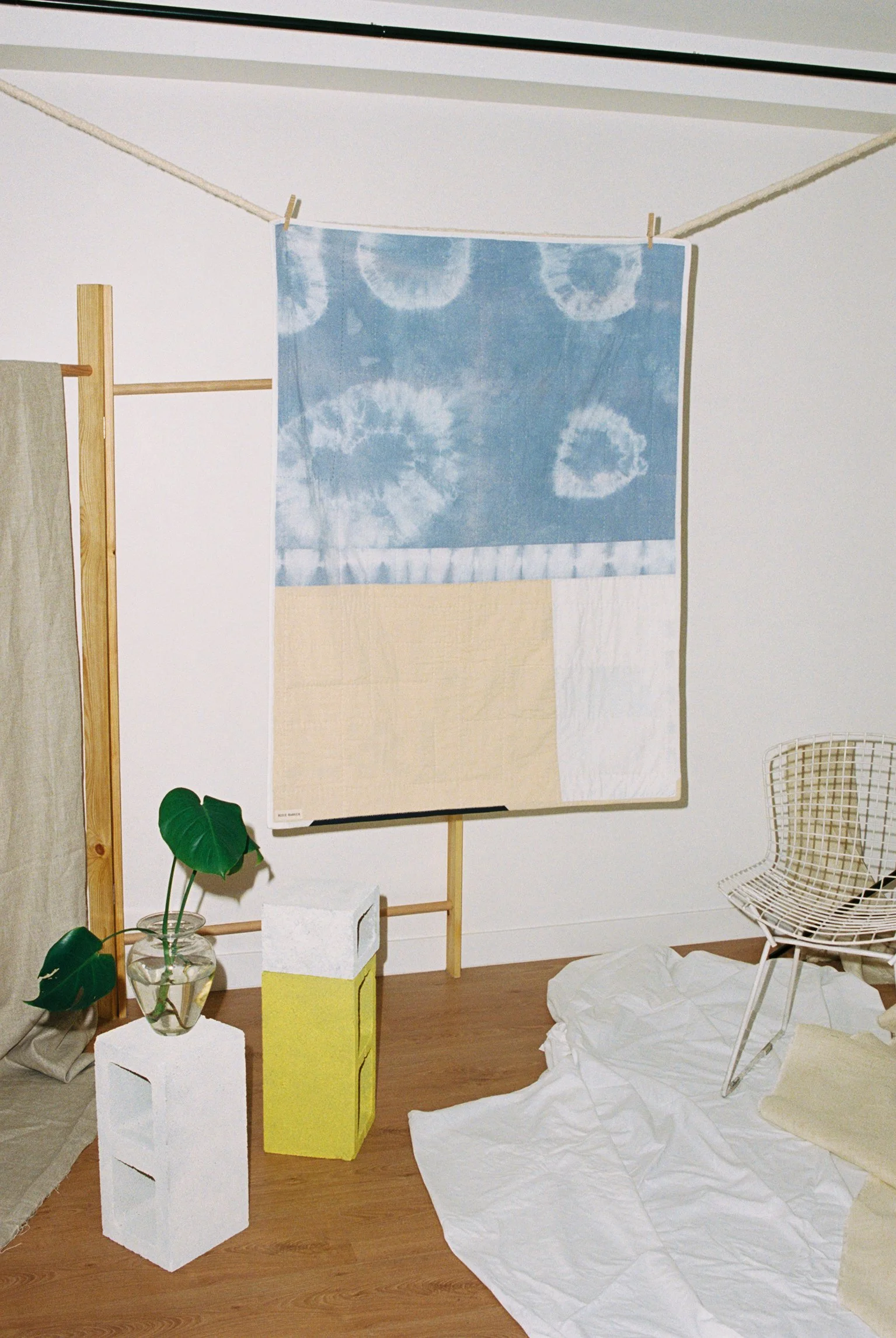 FRONT: Improv patchwork made from a combination of fabric scraps from pandemic-era face masks, as well as hemp linen remnants from a cutting room floor.