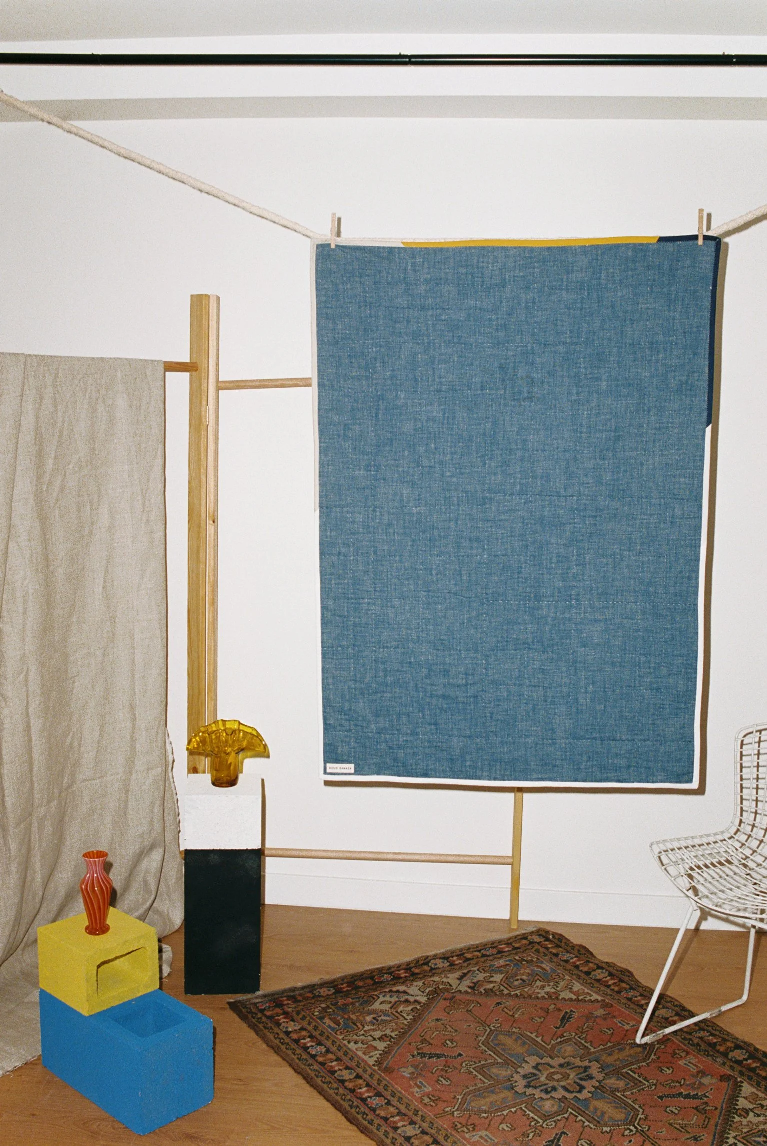 BACK: Blue deadstock chambray with white, grey, gold, and navy binding.
