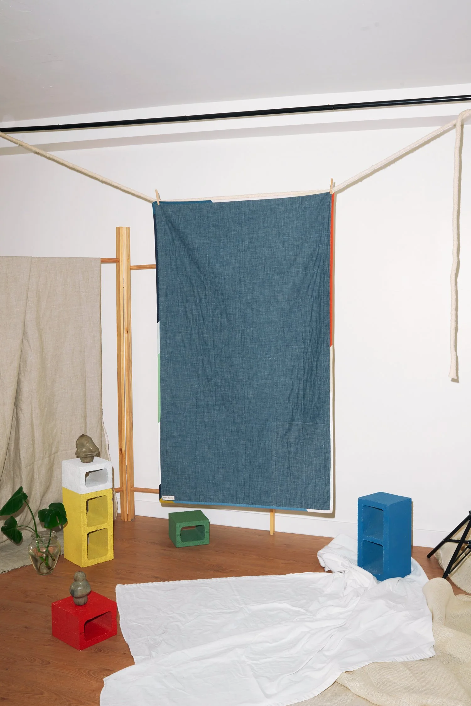 BACK: Blue chambray with red, white, cerulean and navy blue, and mint green binding.